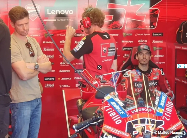 Eine zentrale Rolle spielte an diesem Montag Casey Stoner. Der zweifache Weltmeister war nach dem Grand-Prix-Wochenende, an dem er neben anderen als MotoGP-Legende geehrt, geblieben, um Bagnaia in der Ducati-Box zu unterstützen.