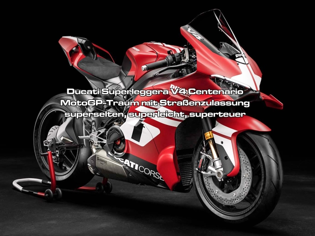 Ducati Superleggera V4 Centenario: Superselten, superleicht, superstark und superteuer. Centenario steht für das 100-jähriges Jubiläum der Marke Ducati, die 1926 gegründet wurde.