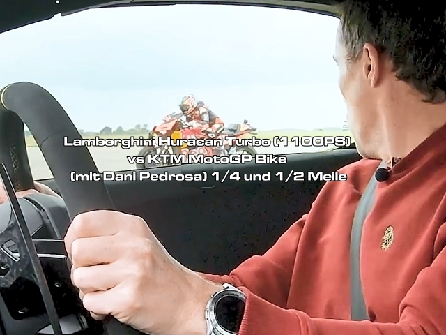 Lamborghini Huracan Turbo (1100ps) vs KTM MotoGP Bike (mit Dani Pedrosa) 1/4 und 1/2 Meile