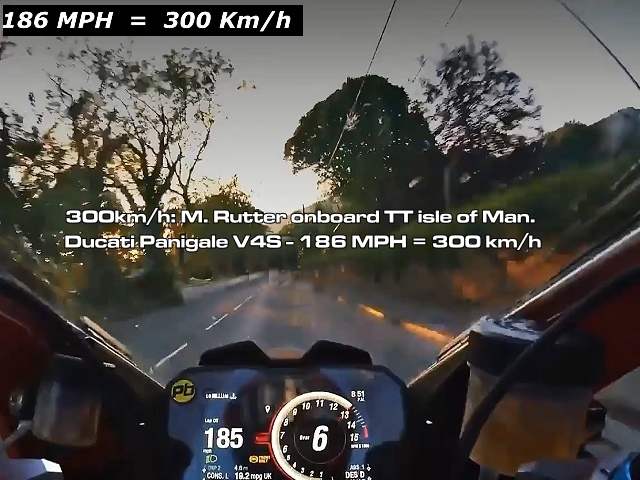 Abartig schnell: Michael Rutter onboard Ducati Panigale V4S bei der Isle of Man TT 2018. Tacho ist in Meilen (186MPH = 300 km/h)