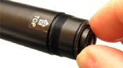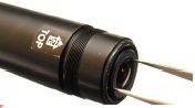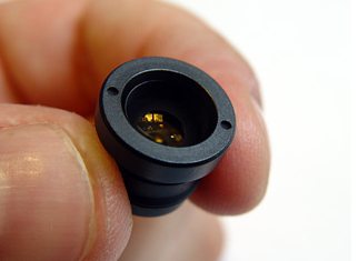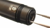 Sie können nun mit der mitgelieferten Pinzette vorsichtig das Objektiv aus der Kamera herrausdrehen. Setzten Sie die Pinzette an den beiden kleinen Löchern am Objektiv an. Wie die Schutzkappe hat auch das Objektiv ein Rechtsgewinde und lässt sich somit nach Links herrausdrehen.